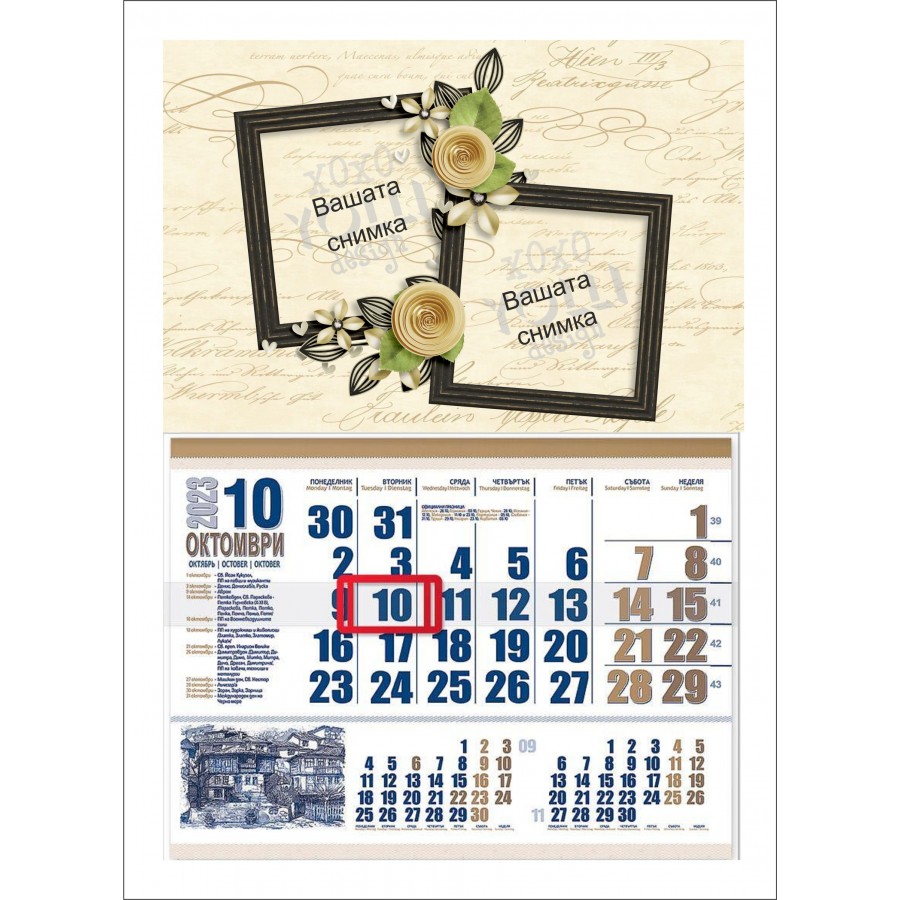 Календар със снимка в рамка с цветя. Изберете този стилен, функционален и компактен работен календар. Предназначен за закачане на стена
