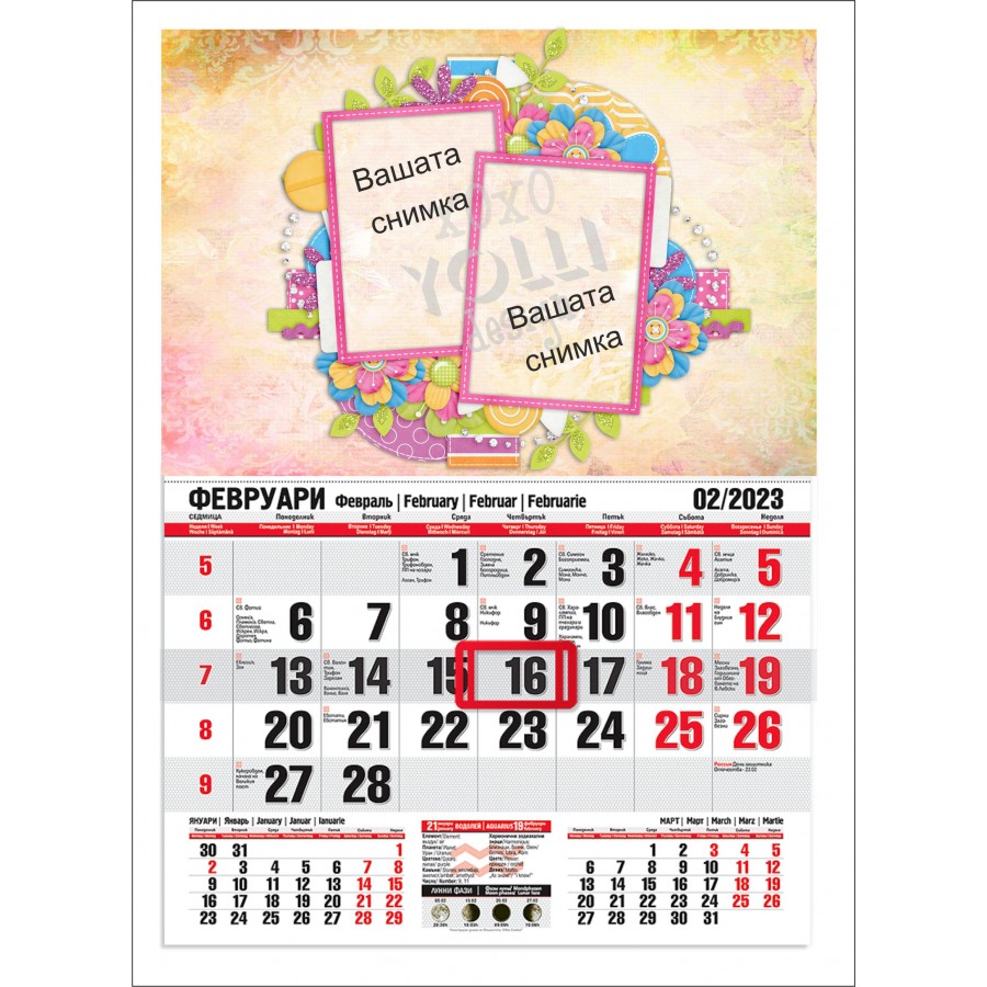 Календар със снимка. Изберете този стилен, функционален и компактен работен календар. Предназначен за закачане на стена.